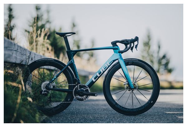 Vélo de Route Cube Litening Aero C:68X SLX 2025 — Équipé du Sram Red AXS 12 vitesses, roues 700 mm, cadre bleu chrome pour une performance aérodynamique optimale.