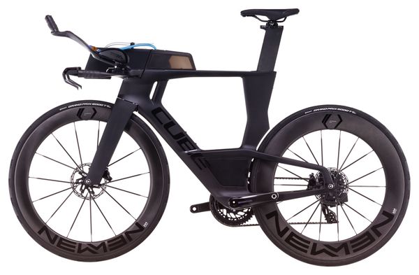 Vous savez que ce vélo est rapide, car le Cube Aerium C:68X SLX est étroitement inspiré du vélo de la triathlète Lucy Charles-Barclay, qui a remporté le championnat du monde. Des options d’hydratation et de stockage configurables se trouvent derrière les capots aérodynamiques, avec la possibilité de faire fonctionner jusqu’à deux systèmes d’hydratation pour une meilleure autosuffisance, même pendant les longues courses. Il est équipé d’une paire de roues Newmen Streem Aero/Sprint TT 60/80 Vonoa avec des pneus Continental Grand Prix 5000 TT TR et des valves aérodynamiques pour une accélération rapide, des performances aérodynamiques supérieures et une adhérence sûre dans les virages.