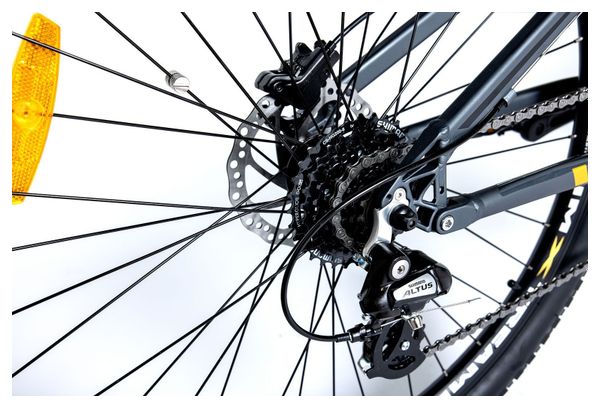 Découvrez le VTT électrique EMTB-29 Full Suspension, équipé d’un moteur central puissant et d’une transmission Shimano Altus 8 vitesses pour des performances optimales sur tous les terrains.