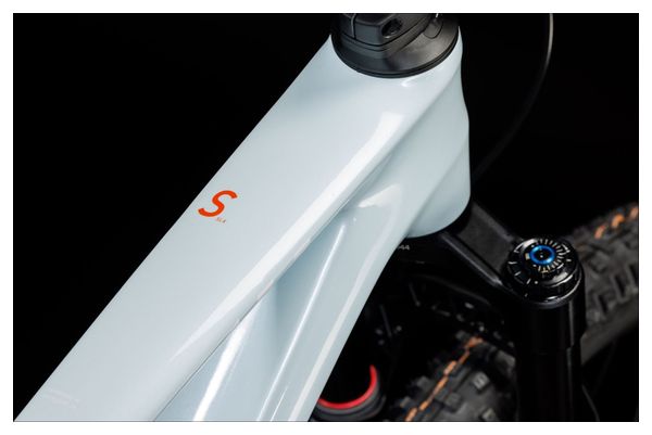 VTT tout-suspendu Cube Stereo One44 C:68X SLX 2024, équipé d’une transmission Sram GX Eagle AXS 12 vitesses et de roues 29 pouces, en coloris Blanc Bleu Frost, conçu pour la performance et l’agilité sur les trails exigeants.